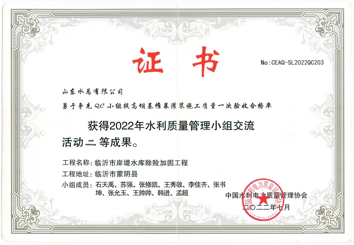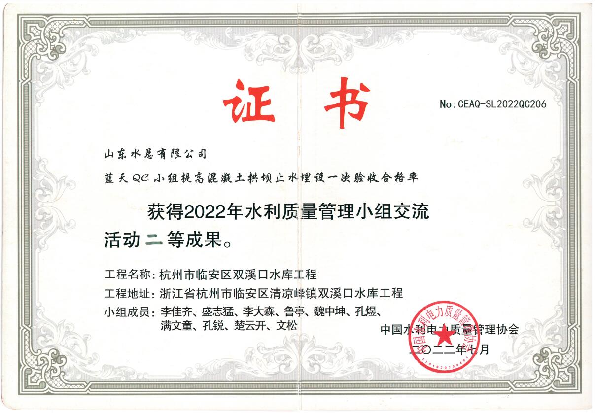 近日,中国水利电力质量管理协会2022年水利质量管理小组交流活动结果与获奖名单揭晓,天行体育网址_天行(中国)申报的《提高钢坝闸闸墙外观质量一次验收合格率》获得一等成果、《提高混凝土拱坝止水埋设一次验收合格率》《提高大体积现浇混凝土强约束区温度控制水平》《提高坝基帷幕灌浆施工质量一次验收合格率》3项成果获得二等成果。