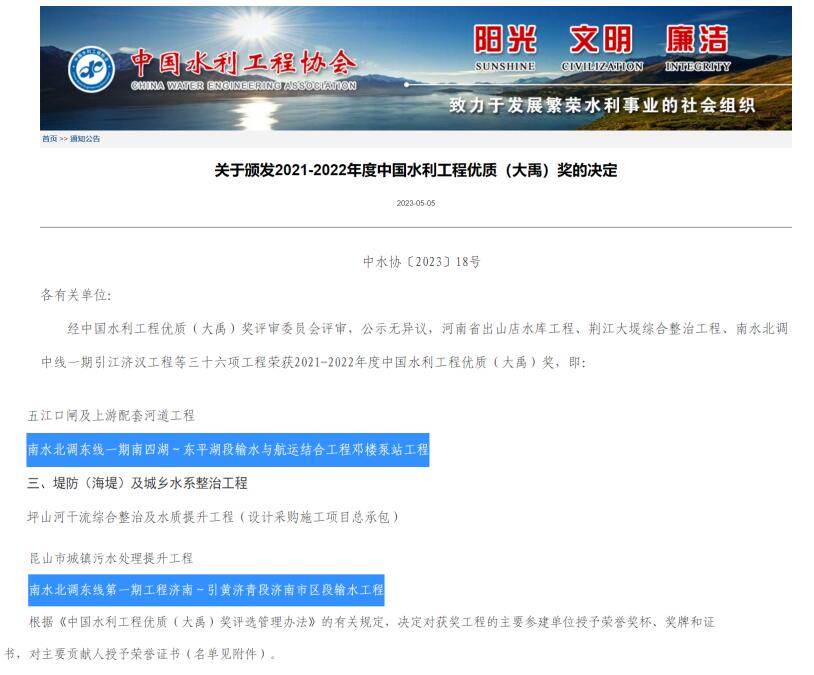 近日,中国水利工程协会发布《关于颁发2021-2022年度中国水利工程优质(大禹)奖的决定》,我天行体育网址_天行(中国)参建的南水北调东线第一期工程济南~引黄济青段济南市区段输水工程和南水北调东线一期南四湖~东平湖段输水与航运结合工程邓楼泵站工程荣获此项殊荣。