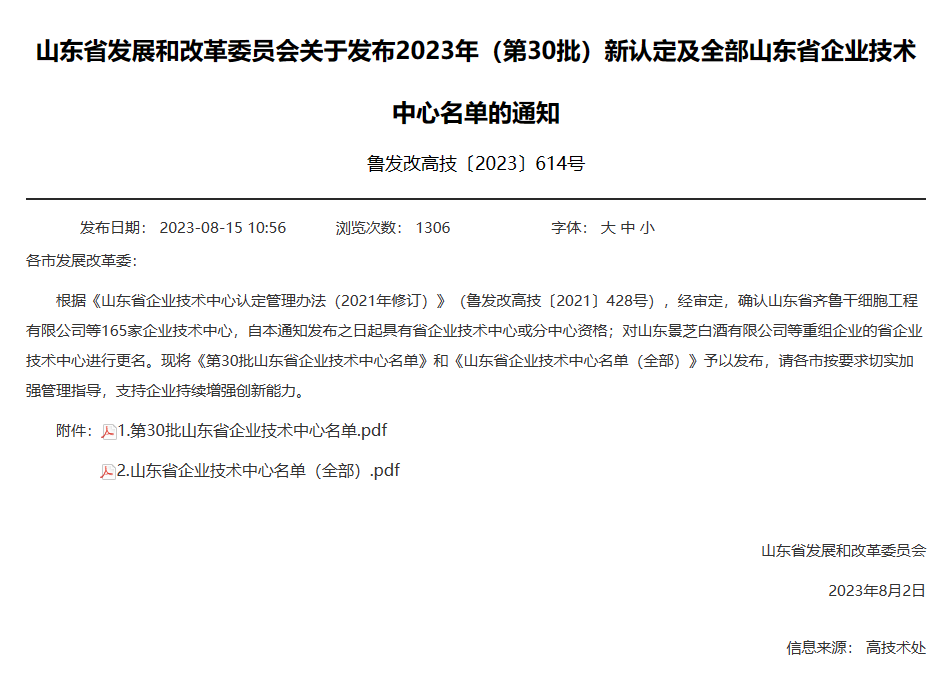 8月15日,山东省发展和改革委员会发布2023年山东省企业技术中心名单,天行体育网址_天行(中国)凭借自身综合创新能力成功入选,获评山东省企业技术中心称号。