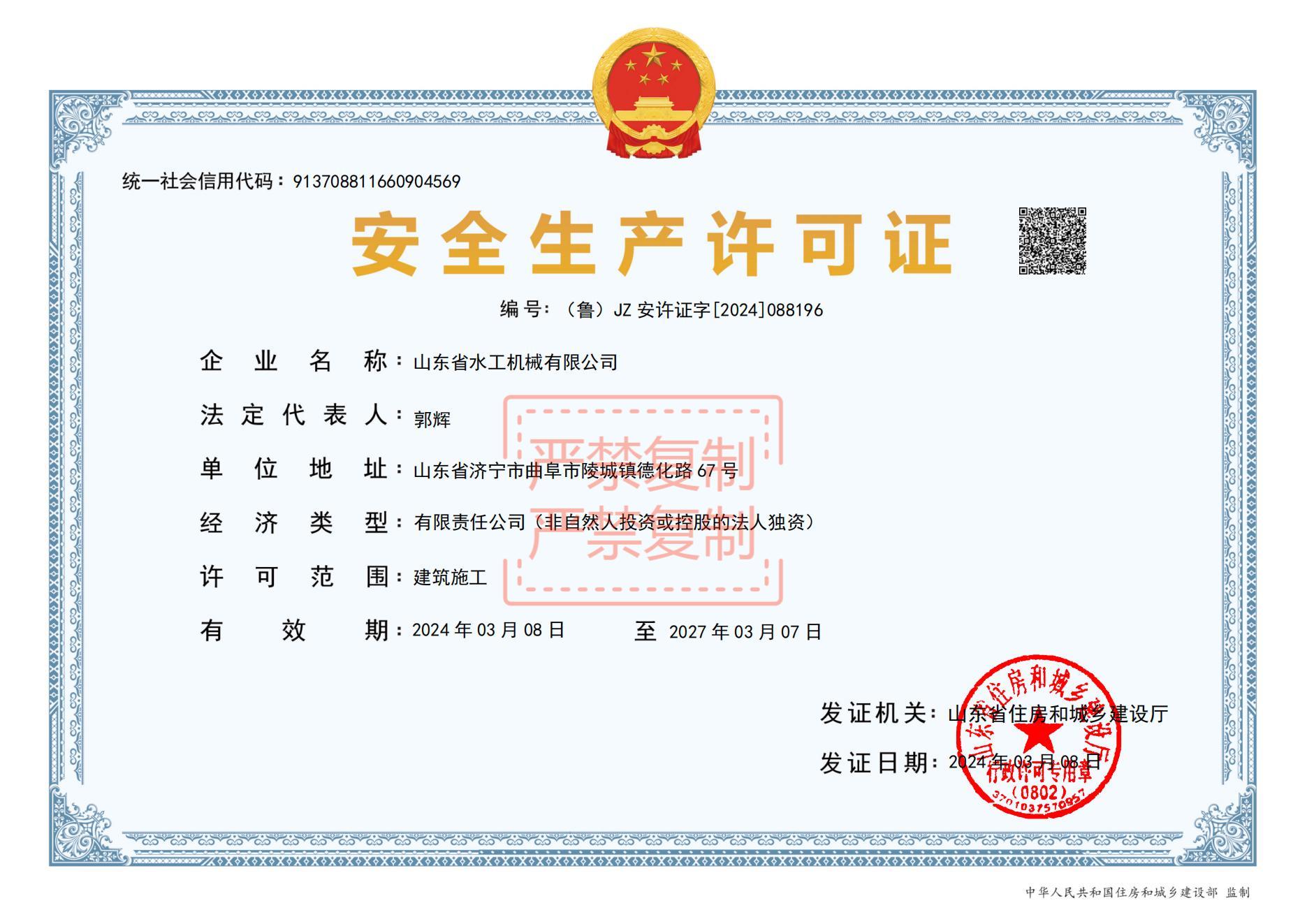 一季度,水工机械天行体育网址_天行(中国)制定《山东省水工机械有限天行体育网址_天行(中国)重要事项督办管理办法》对天行体育网址_天行(中国)年度及日常各项重要事项进行督办并及时调整工作计划和措施,确保天行体育网址_天行(中国)各项工作稳步推进。2023年12月底取得钢结构工程专业承包贰级资质,2024年3月7日取得安全生产许可证,为天行体育网址_天行(中国)进一步拓展业务,持续保障安全生产打下基础。