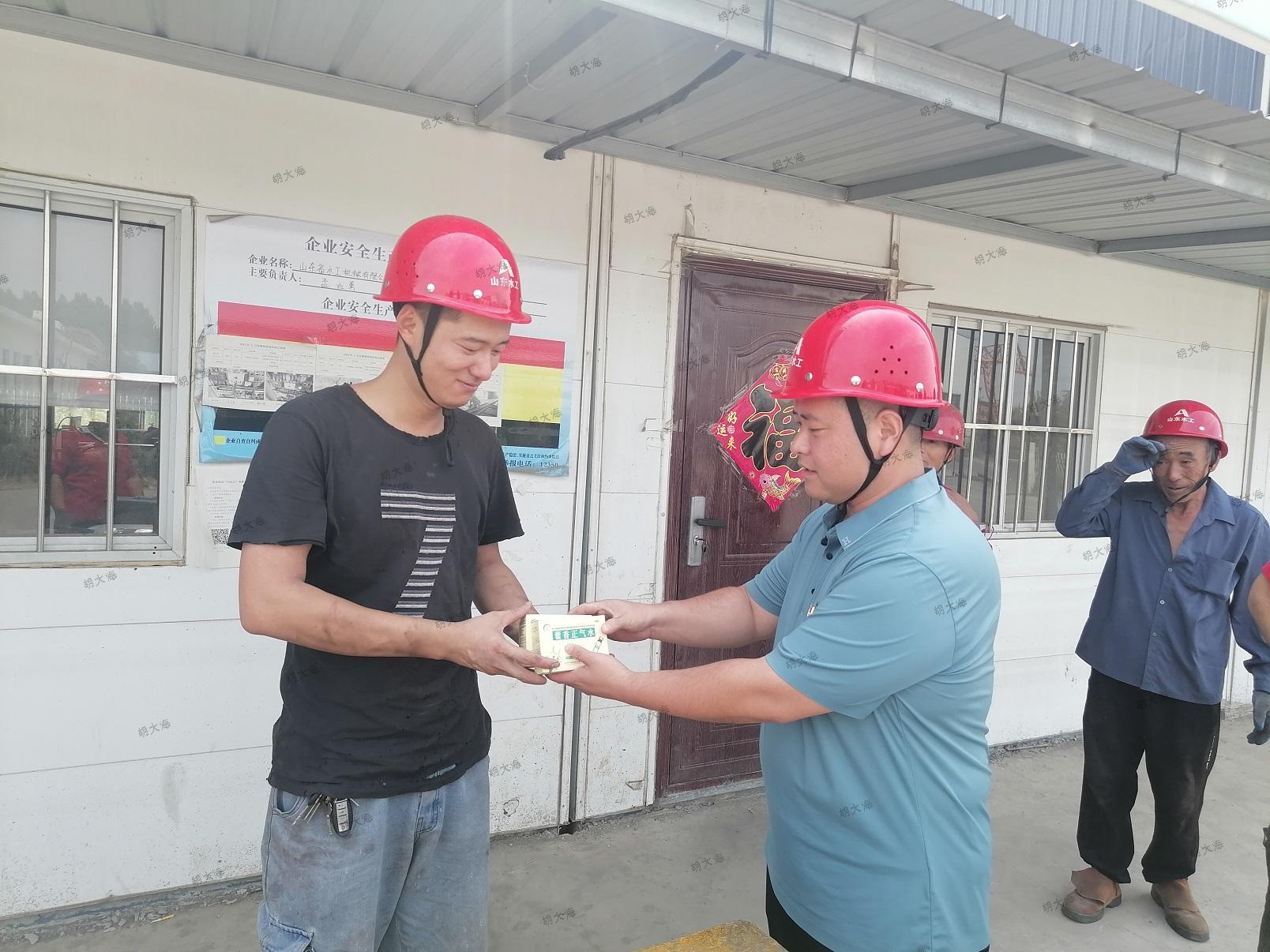 水工机械天行体育网址_天行(中国)领导心系农民工,组织召开专题会议部署防暑降温工作。各部门以多形式积极落实会议精神,其中安全生产部深入生产一线,给农民工发放防暑物品,为他们送去丝丝凉意,并提醒大家夏季高温作业时要做到不疲劳上岗、不带不良情绪上岗,高高兴兴上班来,平平安安回家去,