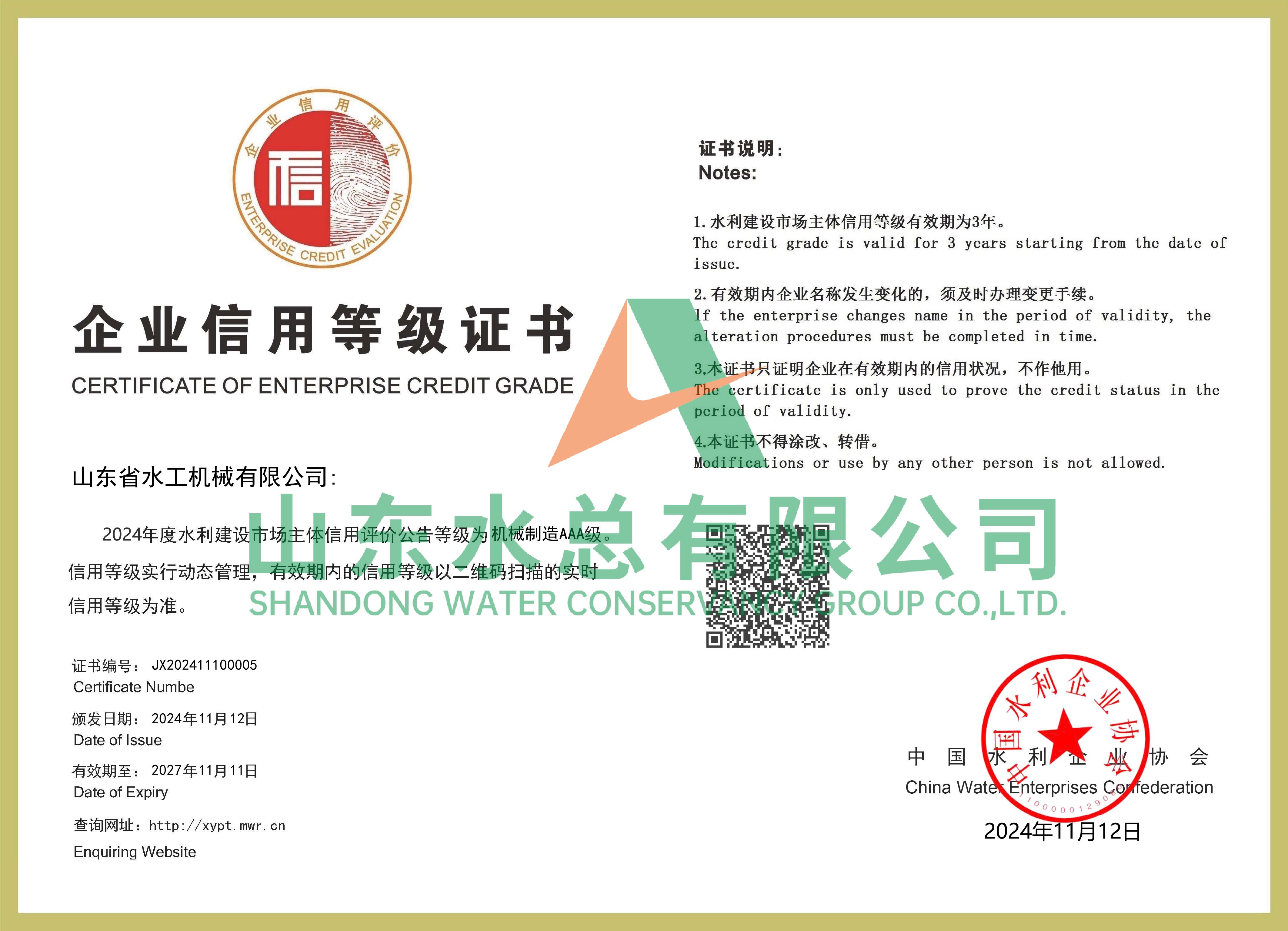 水利建设市场主体信用评价是水利部规范水利建设市场主体行为、加强行业自律的重要手段,其中“AAA”级为水利企业的最高等级信用状况,是衡量企业履约能力、投标信誉的重要因素,是企业综合竞争力最有力的证明。该荣誉的获得,是对水工机械天行体育网址_天行(中国)诚信经营、质量品牌和服务的高度认可,对于天行体育网址_天行(中国)大力开拓市场、提高市场竞争能力、推进企业高质量发展具有重要意义和推动作用。