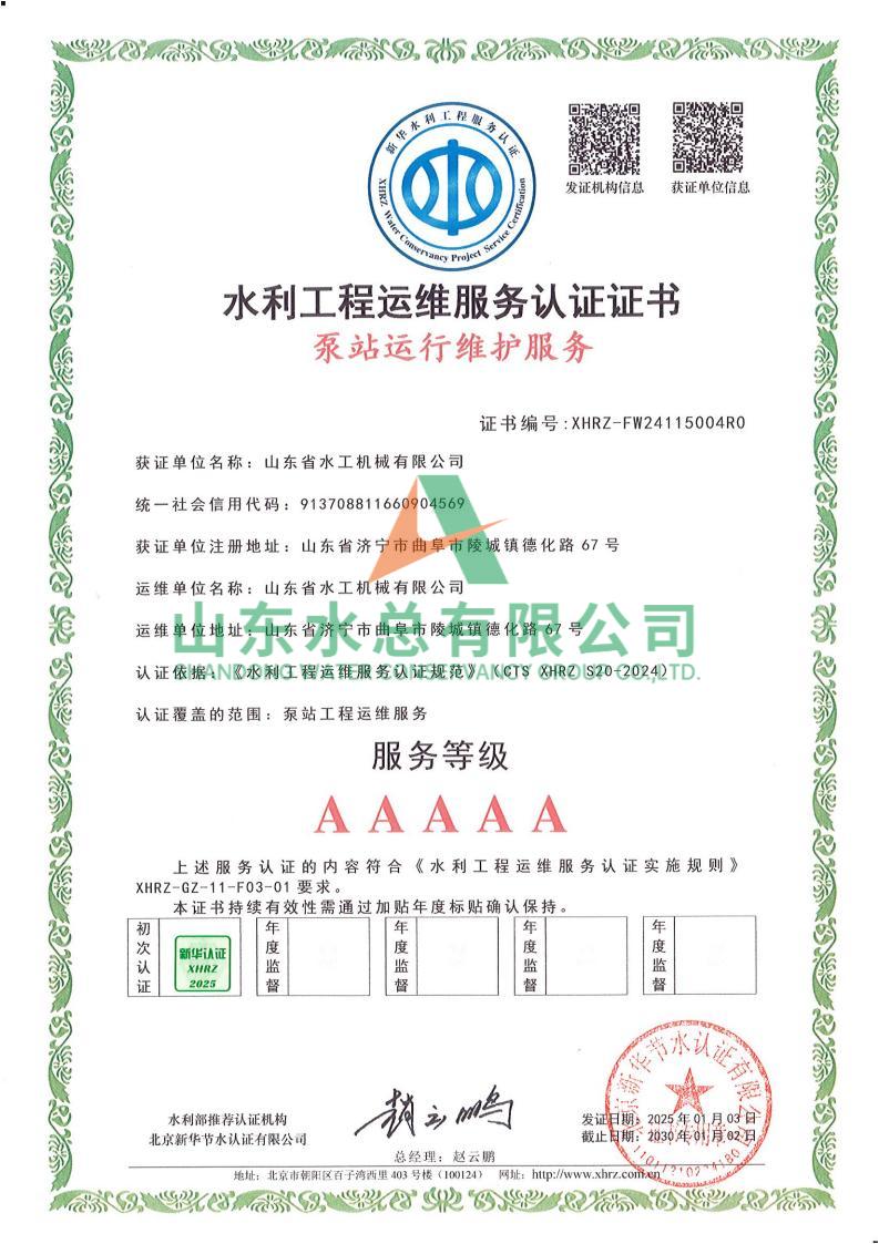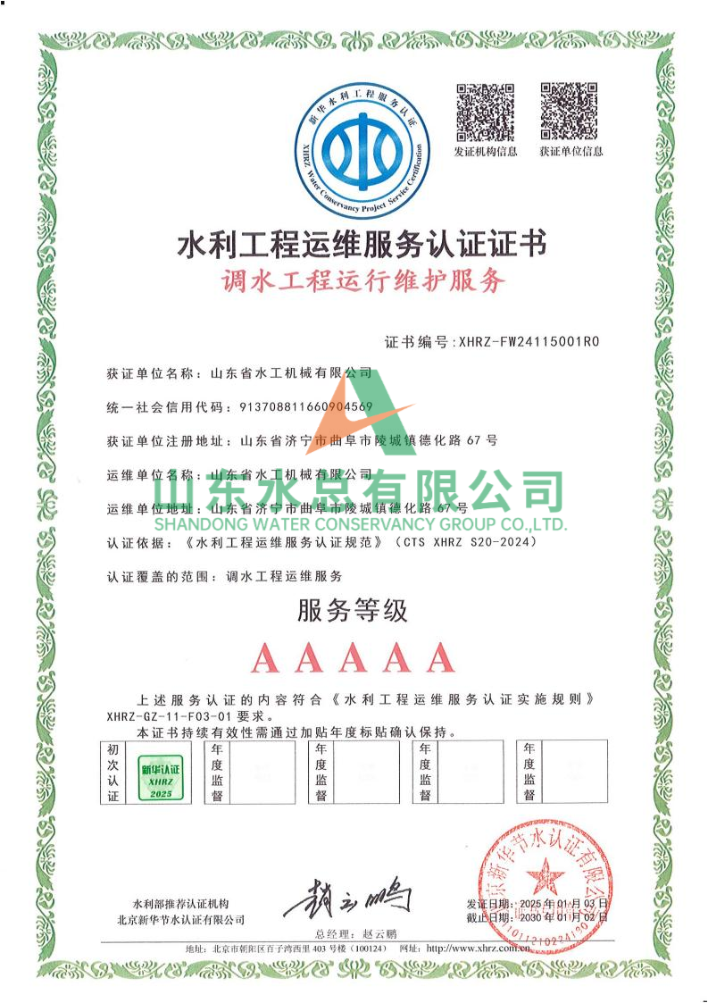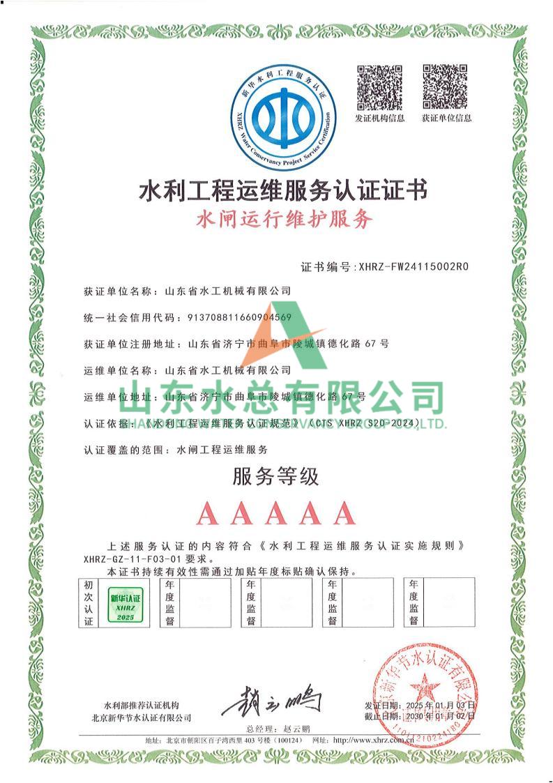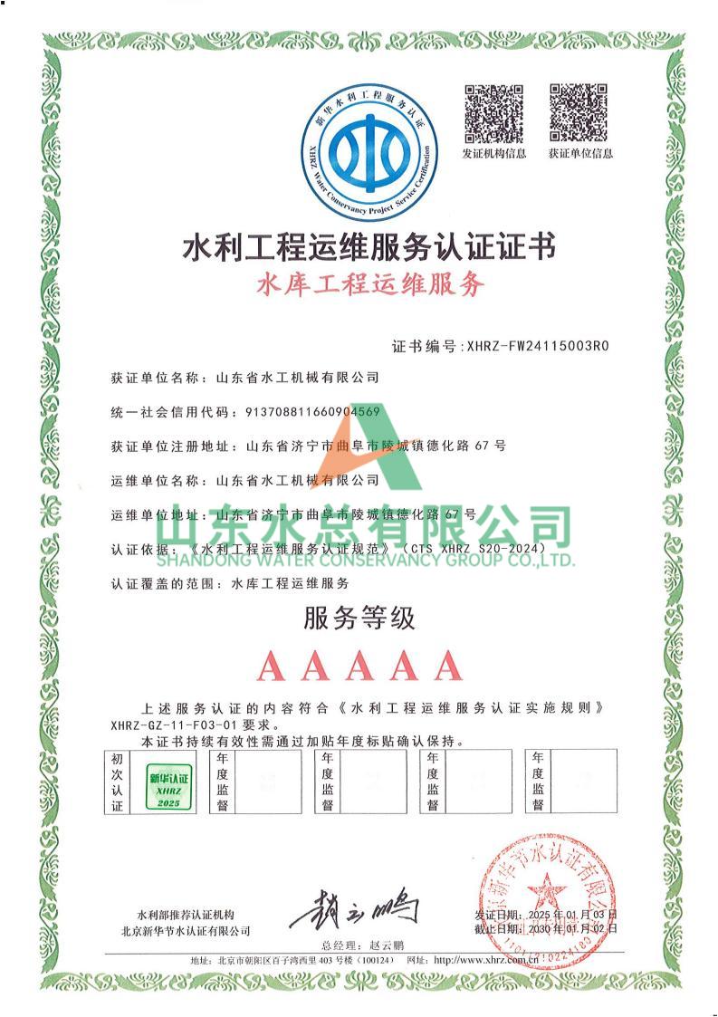 一直以来,水工机械天行体育网址_天行(中国)高度重视水利工程运维服务的质量与专业性,在人员配备、技术应用、管理体系等多方面精心打磨。在认证过程中,历经严格审核,天行体育网址_天行(中国)凭借扎实的运维实力、规范的服务流程以及对水利工程运维高规格的执行标准,赢得了认可。