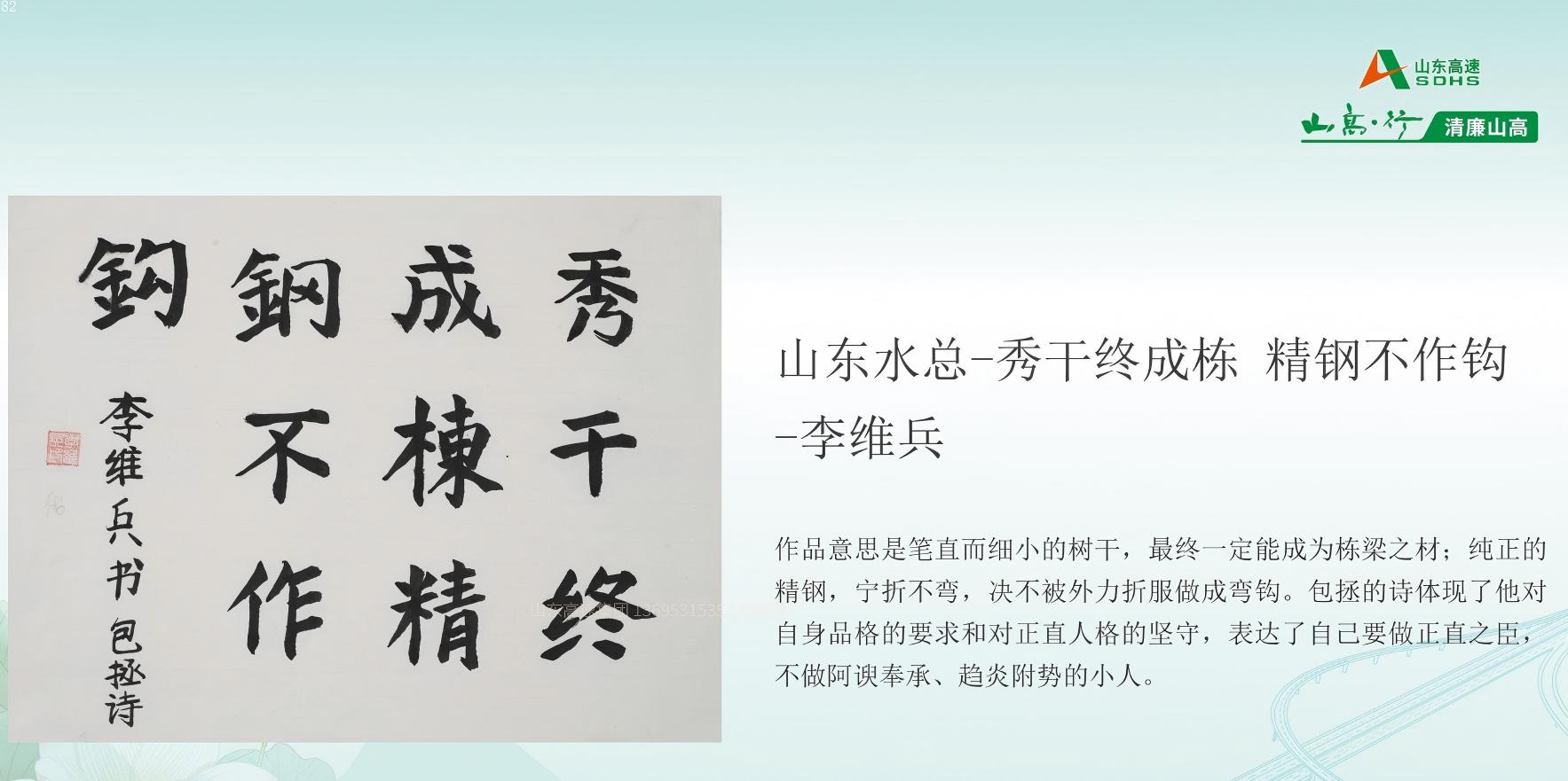 6月11日,在山东高速集团纪委组织的“清廉山高”廉洁文化作品征集活动中,山东水总基础工程有限天行体育网址_天行(中国)制作的短视频《筑廉洁防线,守初心之路》荣获“光影映廉”板块三等奖,第二分天行体育网址_天行(中国)李维兵的书法作品《秀干终成栋,精钢不作钩》摘得“工艺创廉”书法类优秀奖。