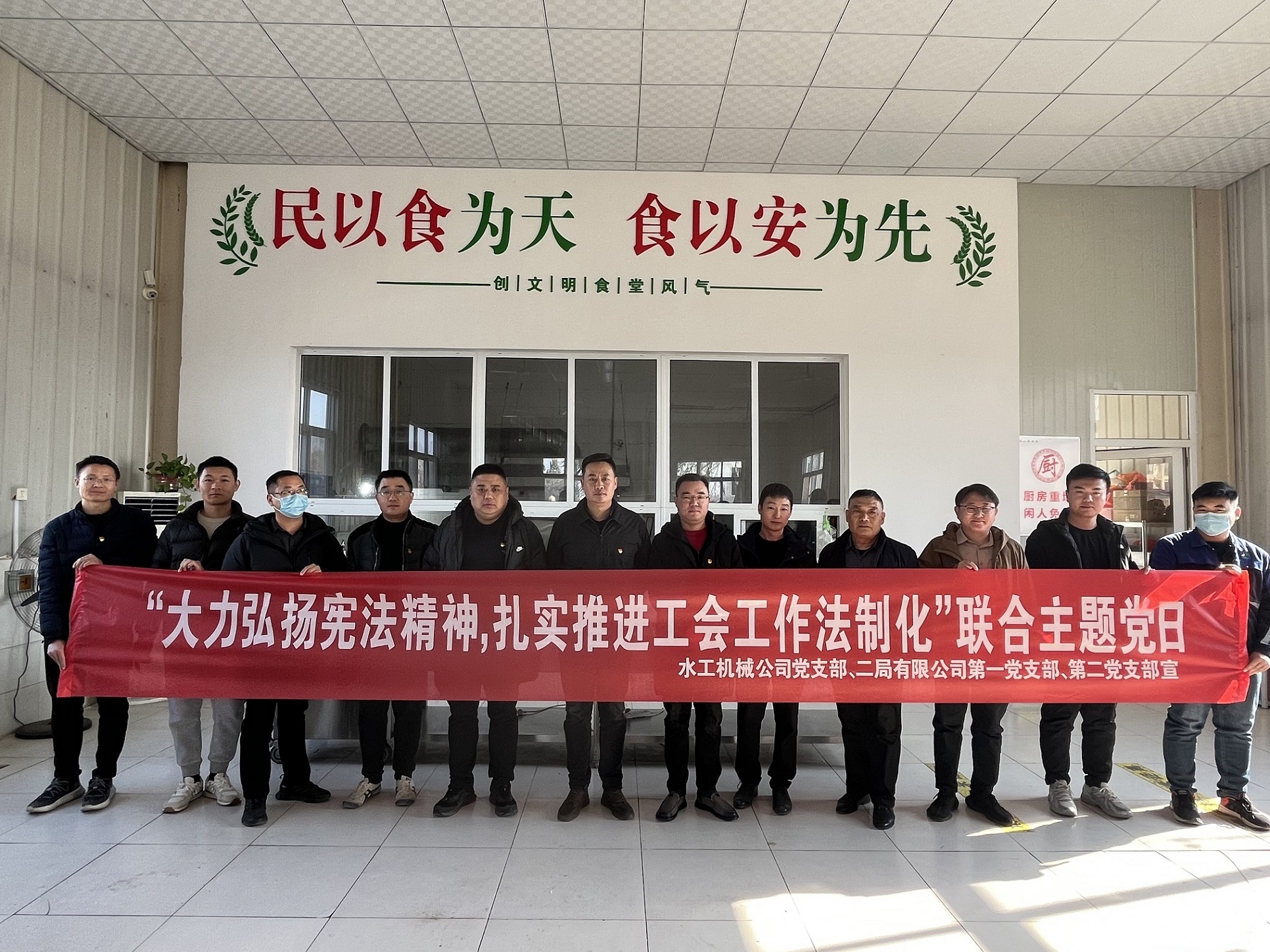 2023 年 12 月 4 日是第十个国家宪法日,为大力弘扬宪法精神,进一步营造尊法学法守法用法浓厚氛围,增强党员干部的宪法意识和党性修养。12月4日,水工机械天行体育网址_天行(中国)党支部联合二局有限天行体育网址_天行(中国)第一党支部、第二党支部共同开展了“大力弘扬宪法精神,扎实推进工会工作法制化”联合主题党日活动。