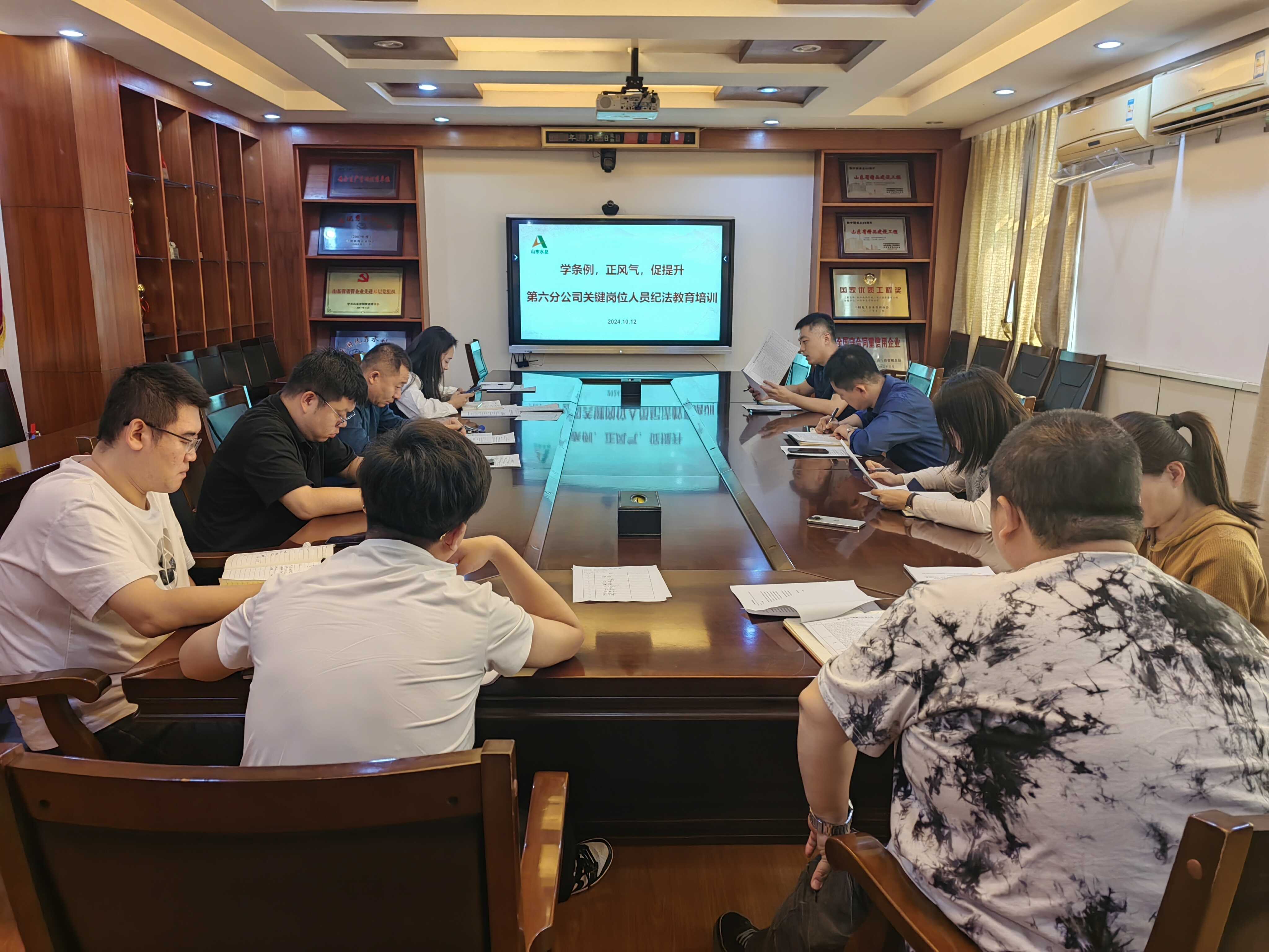 为进一步巩固深化党纪学习教育成果,推动“作风建设强化年”走深走实,10月12日,第六分天行体育网址_天行(中国)在七楼会议室组织财务管理、投资经营、工程管理、招标采购、人力资源等关键岗位人员开展纪法教育培训。第六分天行体育网址_天行(中国)副总经理盛志猛主持会议。